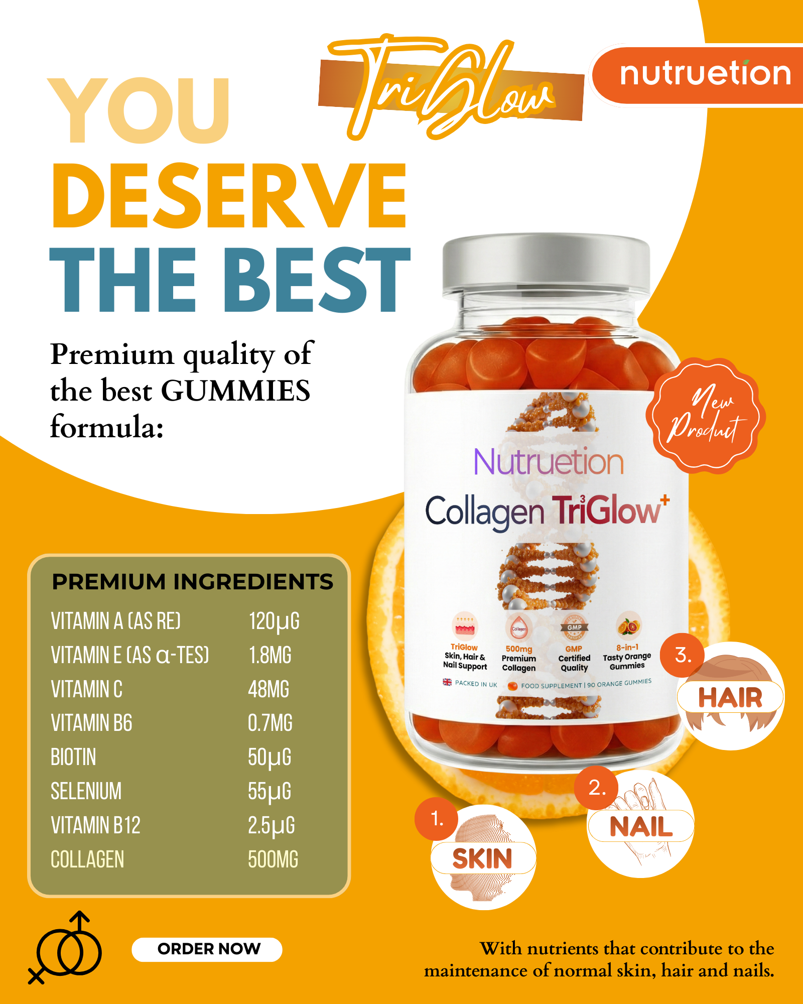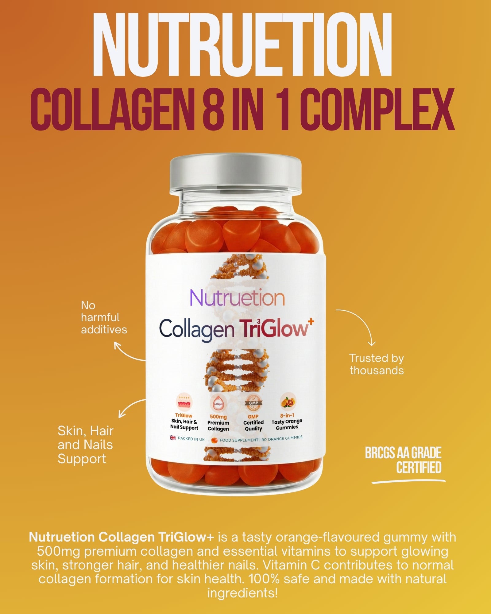 Discover the smarter way to support your natural glow with Nutruetion TriGlow+, an advanced 8-in-1 supplement that combines high-strength collagen with essential beauty nutrients in a delicious, easy-to-take gummy.