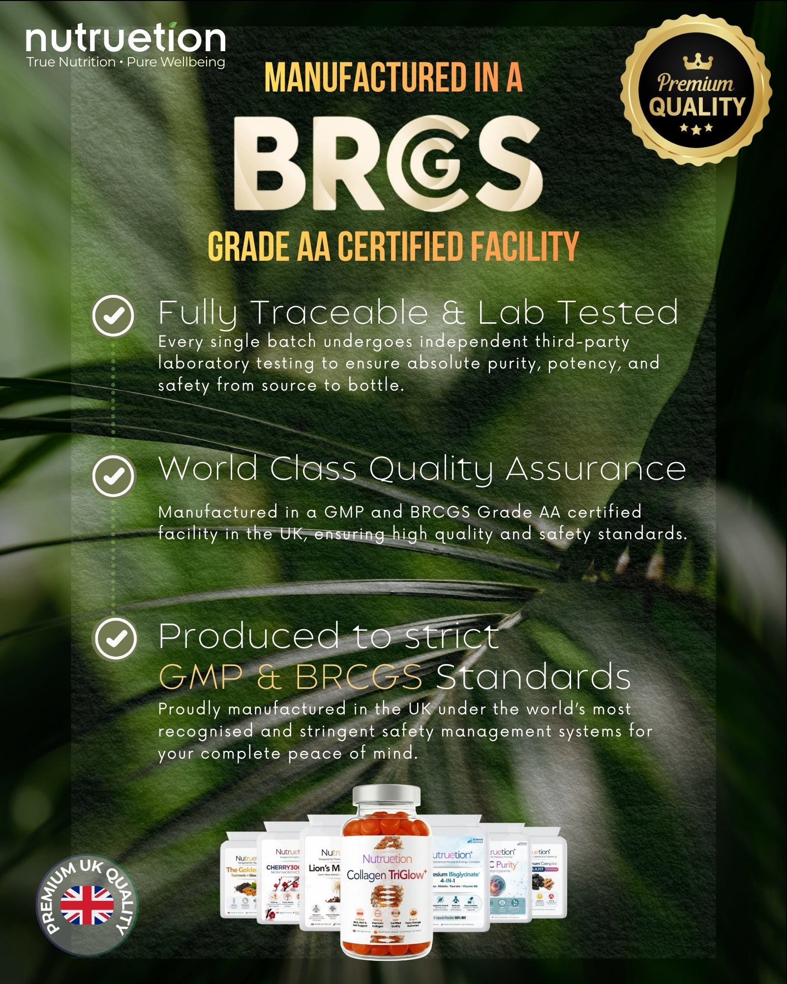 In a market flooded with standard supplements, Nutruetion stands apart. We understand that what you put into your body matters. That is why Collagen TriGlow+ is produced in a BRCGS Grade AA Certified facility in the UK. This ensures a level of safety, purity, and traceability that exceeds standard expectations, ensuring you receive nothing but the best in every bottle.