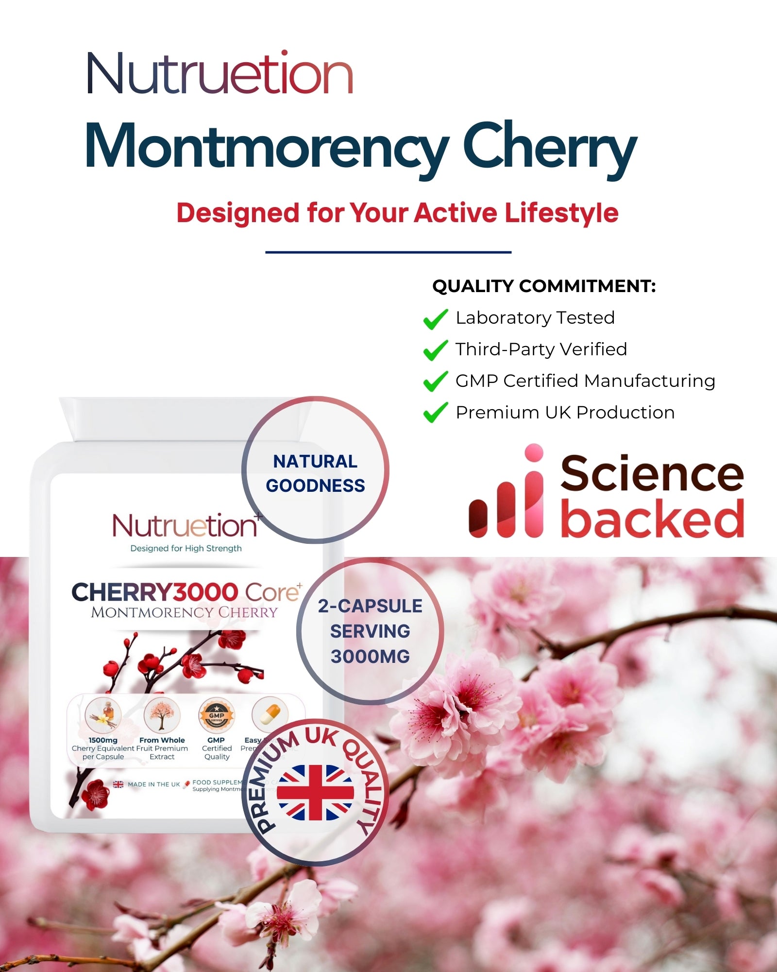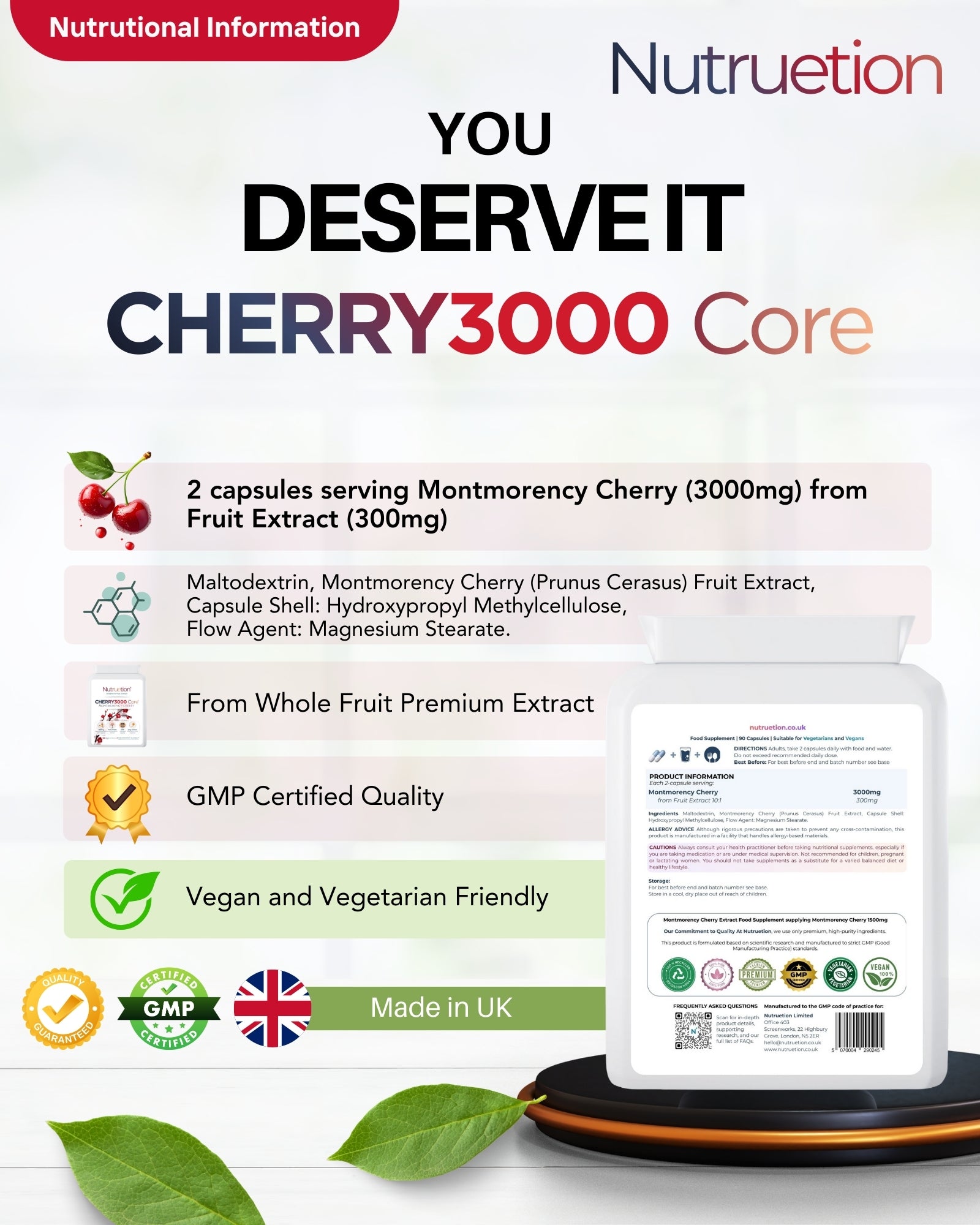 - Nutruetion+ Cherry 3000 Core+ delivers a daily serving of 3000mg Montmorency Cherry. Each easy-to-swallow capsule contains 1500mg equivalent, making it one of the strongest tart cherry food supplements available on the market for your daily routine.