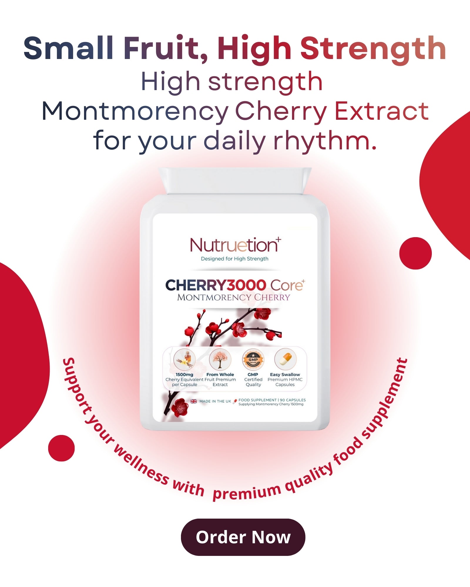This is a food supplement supplying Montmorency Cherry and is not intended to diagnose, treat, cure, or prevent any disease. Food supplements should not be used as a substitute for a varied and balanced diet and a healthy lifestyle.