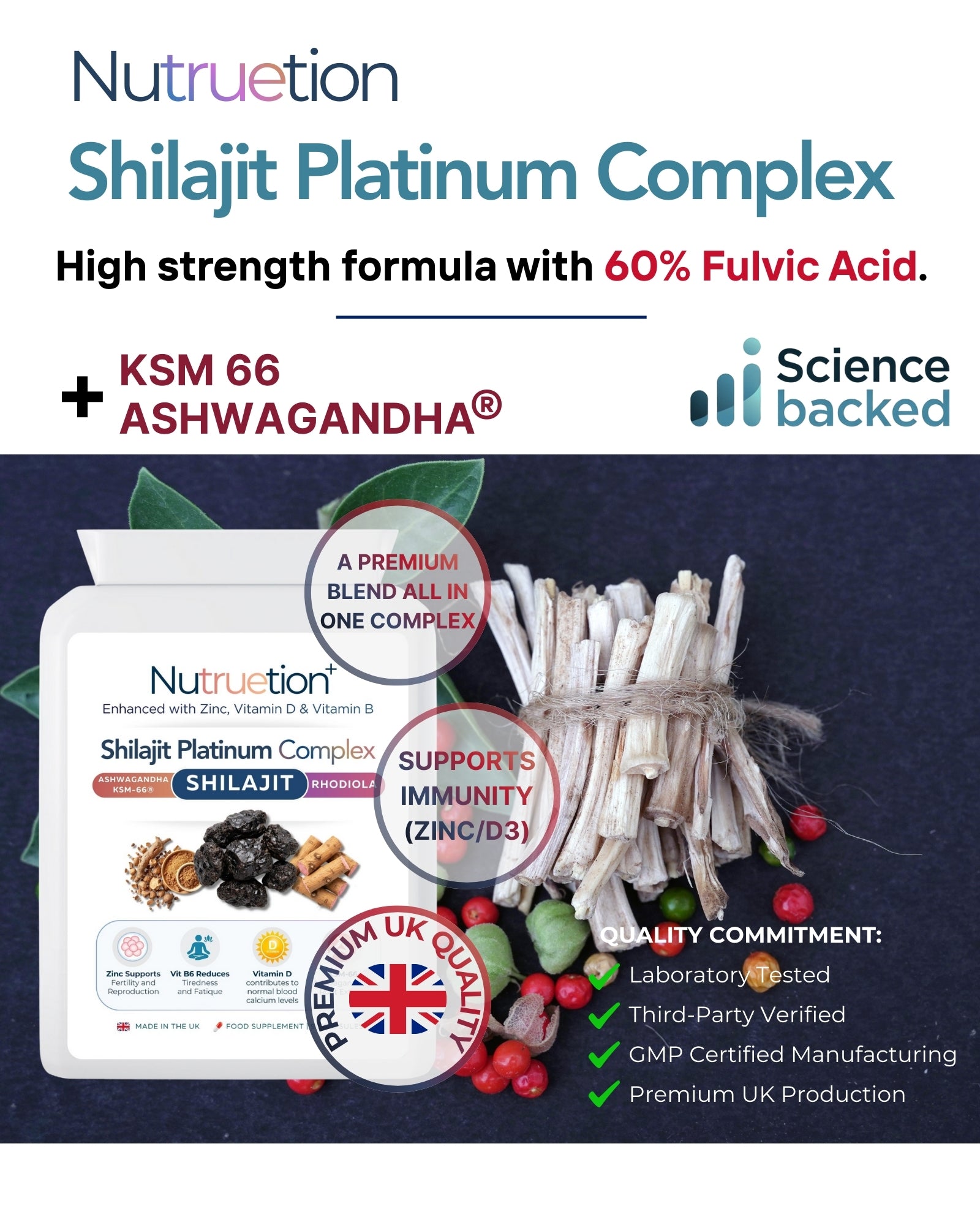 - Shilajit Extract: Standardised to an impressive 60% Fulvic Acid, ensuring you get the active compounds, not just rock powder.